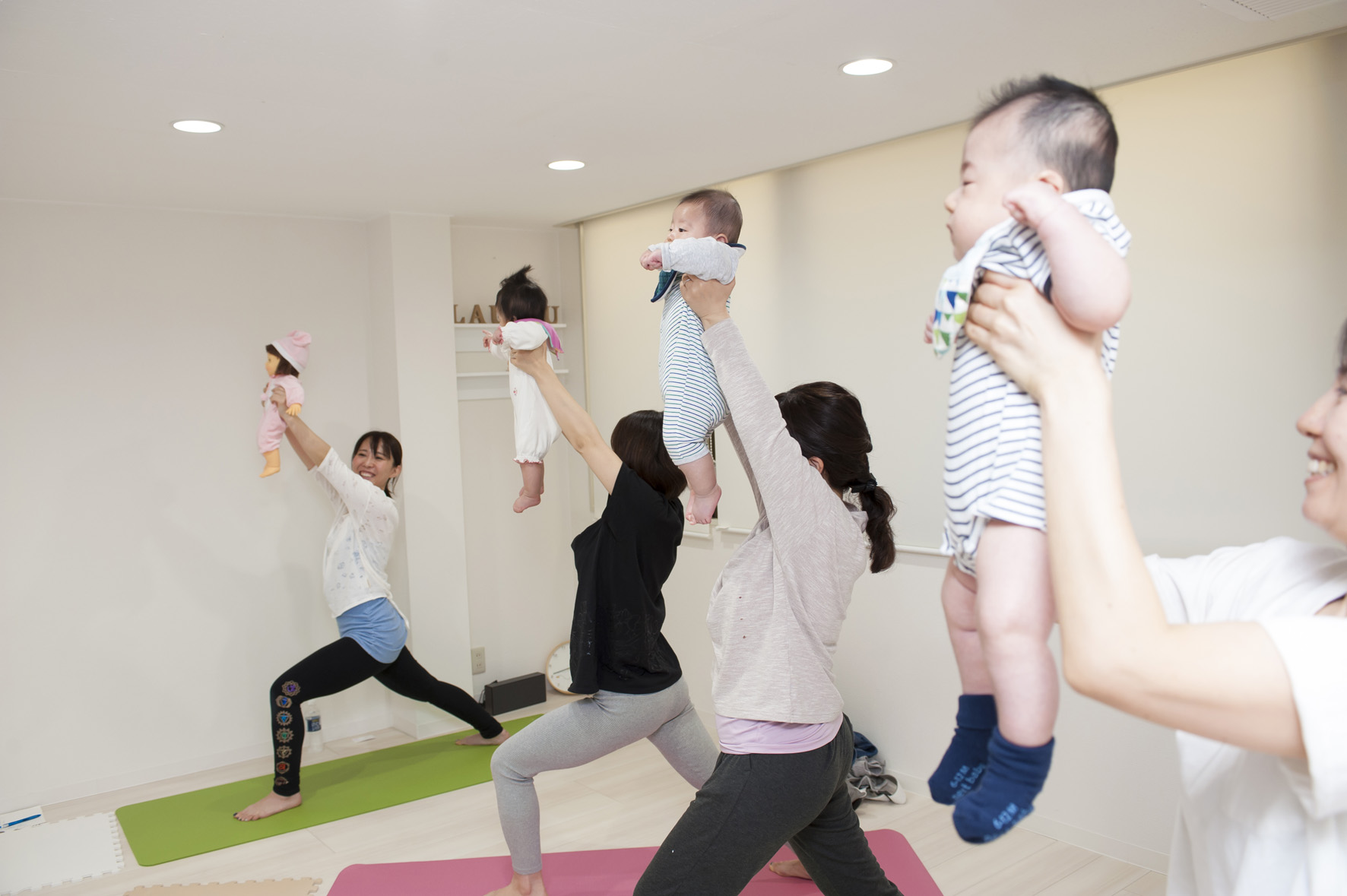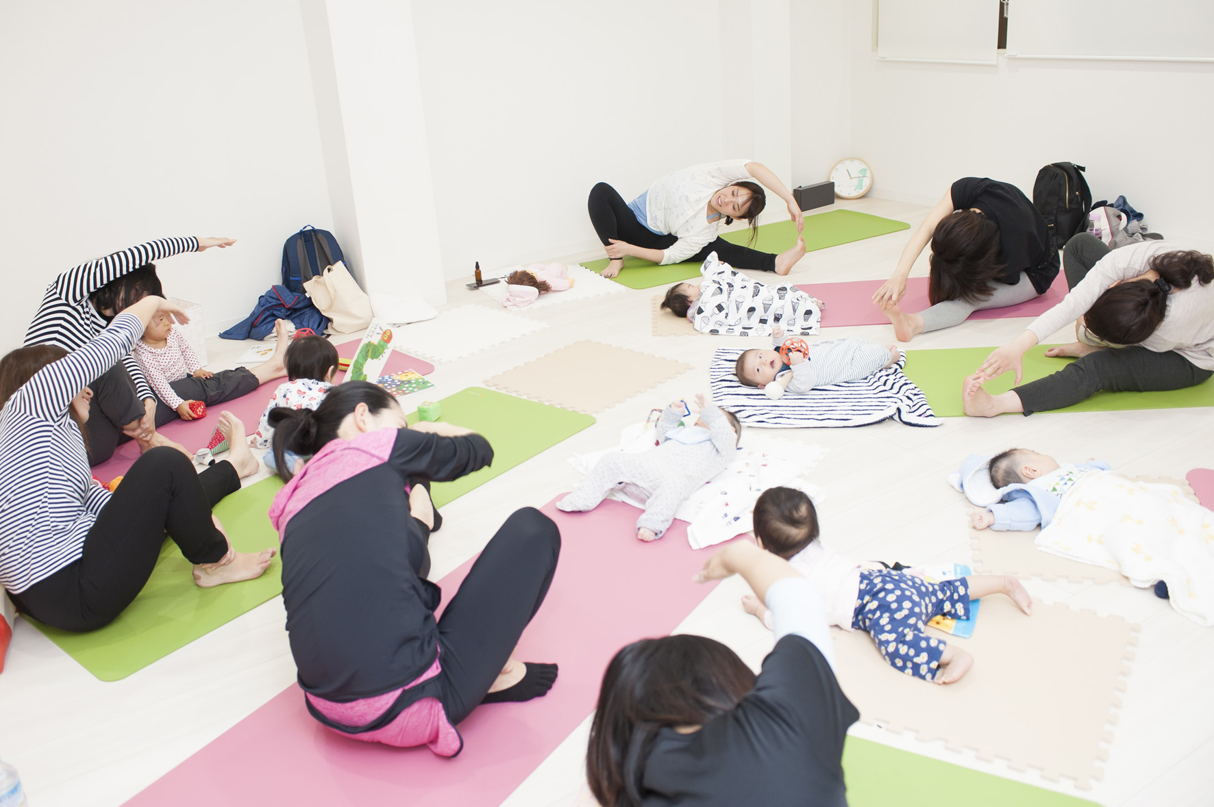 助産院併設スタジオでのレッスンでは、産後ピラティスや、ママとベビーのヨガを担当しています。産後のヨガには、骨盤底筋群を強化したり、滞りがちな血液の流れを改善し、おっぱいの分泌を良くするなどの効果があります。また、レッスン後に「身体が楽になった」「気分転換になった」とママ達の表情が、やわらかく、そして明るくなるのを見ていると、私の方も幸せな気持ちになります。そして、赤ちゃんには毎回癒されています。